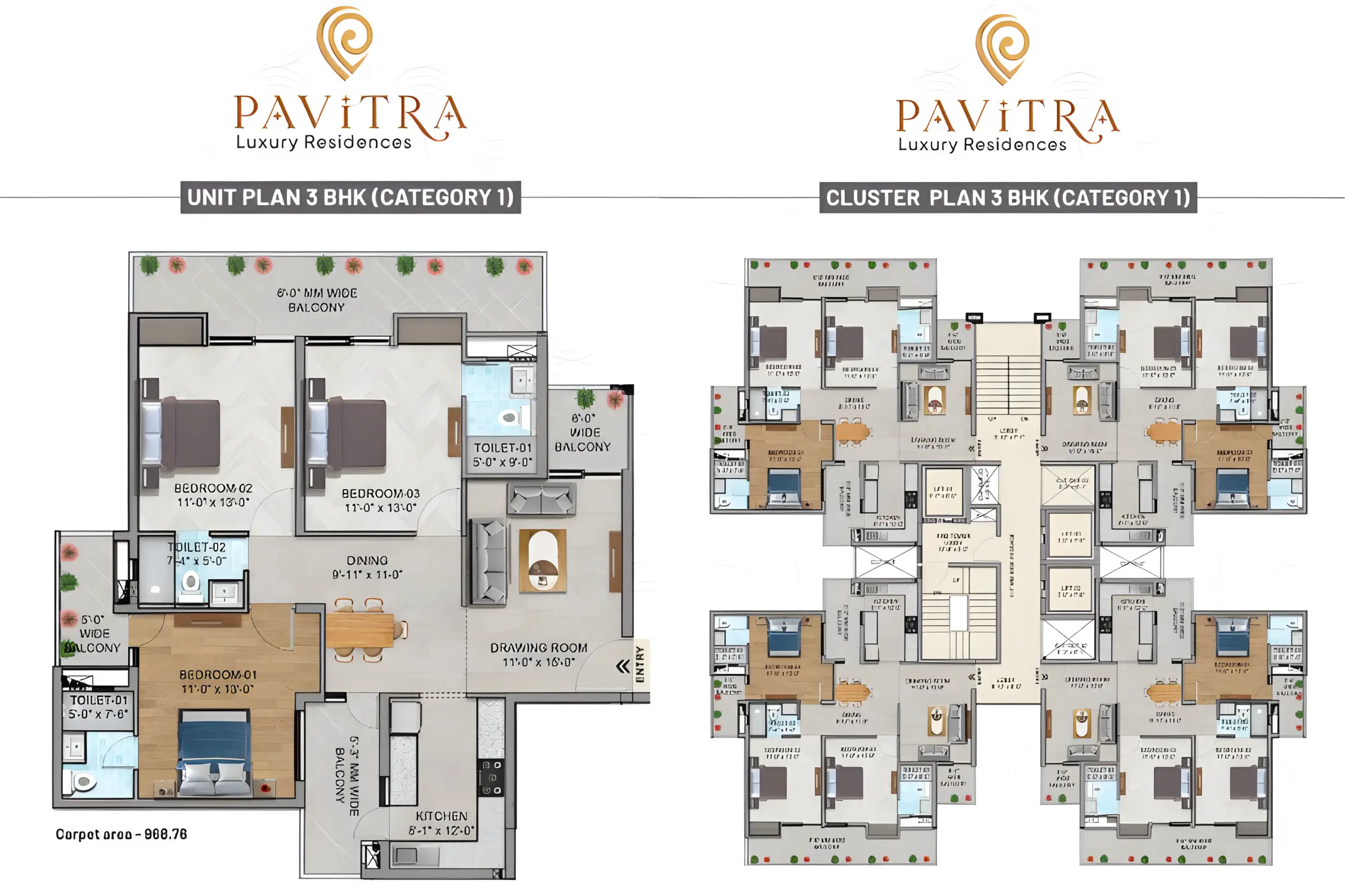 The project offers spacious and intelligently designed 3 BHK apartments with modern layouts.