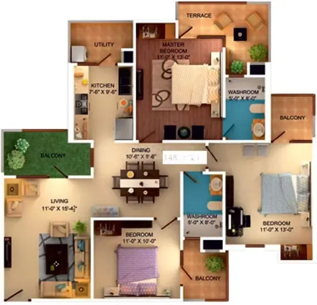 | 3 BHK | 1485 | 1190 | 150 | 84 Lakhs |