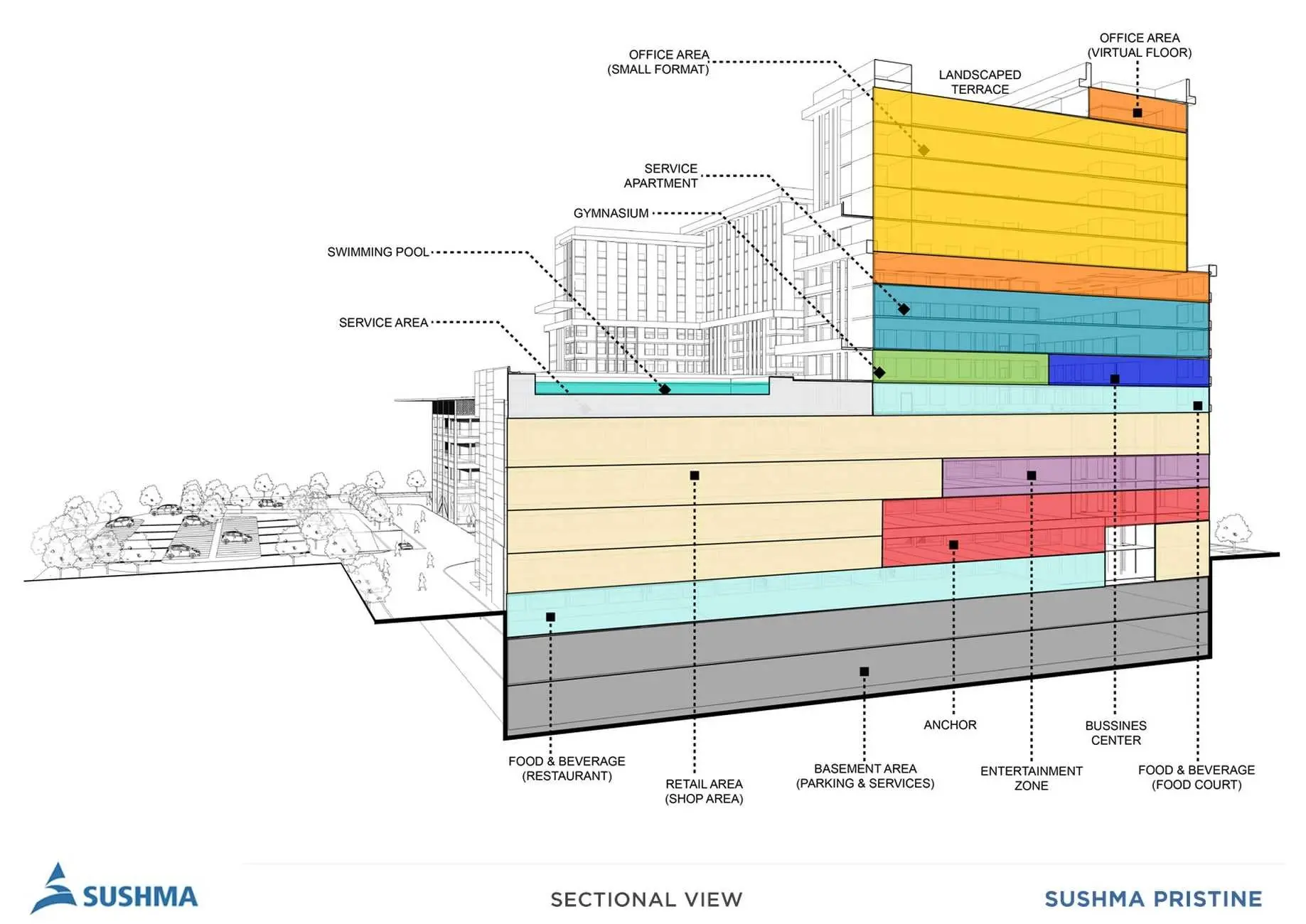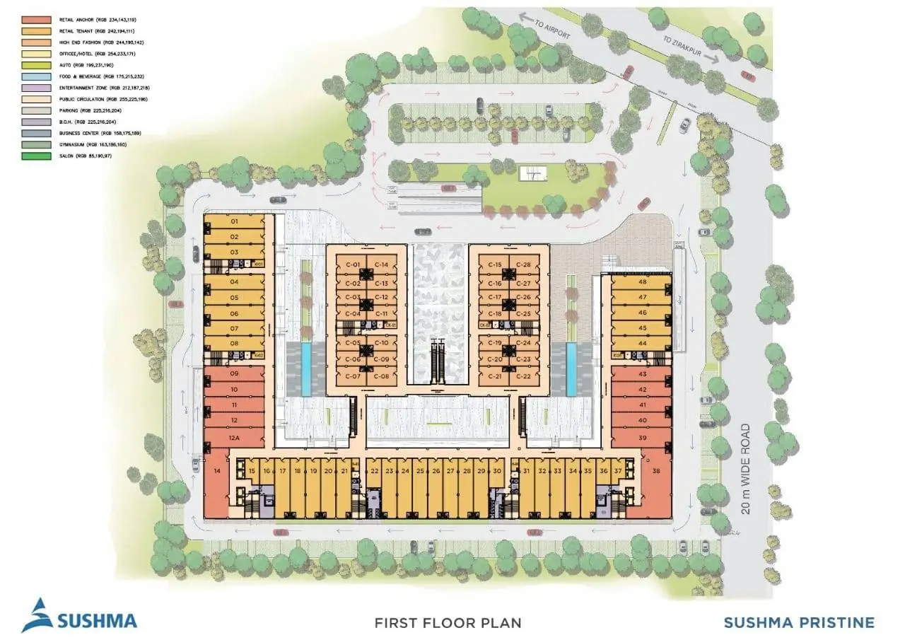 Sushma Pristine is a flagship commercial venture by the renowned Sushma Group, designed to redefine business hubs in the Tricity region. Spread across 7 acres, this expansive complex features a blend of office spaces, retail outlets, and serviced suites, all crafted for efficiency and growth. With its prime positioning near key infrastructure, it's perfect for entrepreneurs and corporations looking to tap into Mohali's booming economy. The project emphasizes sustainability and modern design, ensuring a productive environment that's also environmentally conscious. Whether you're interested in mohali residential projects nearby or purely commercial, Sushma Pristine integrates seamlessly with the area's high rise society in Mohali and upcoming residential projects in Punjab.